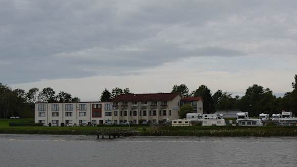 Das Hotel von einem Schiff auf der Eider betrachte