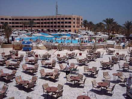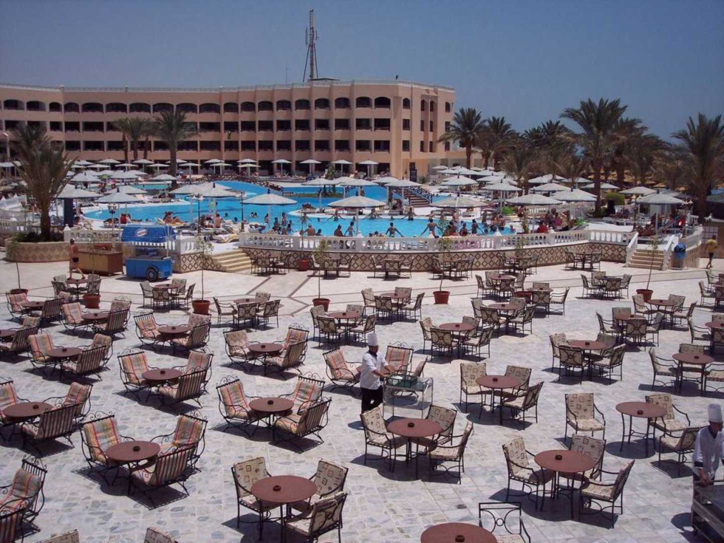 Blick auf die PoolanlageIm vorderen Teil kann man sich am Abend zu Livemusik entspannen und am Tag in der Poolanlage erfrischen.