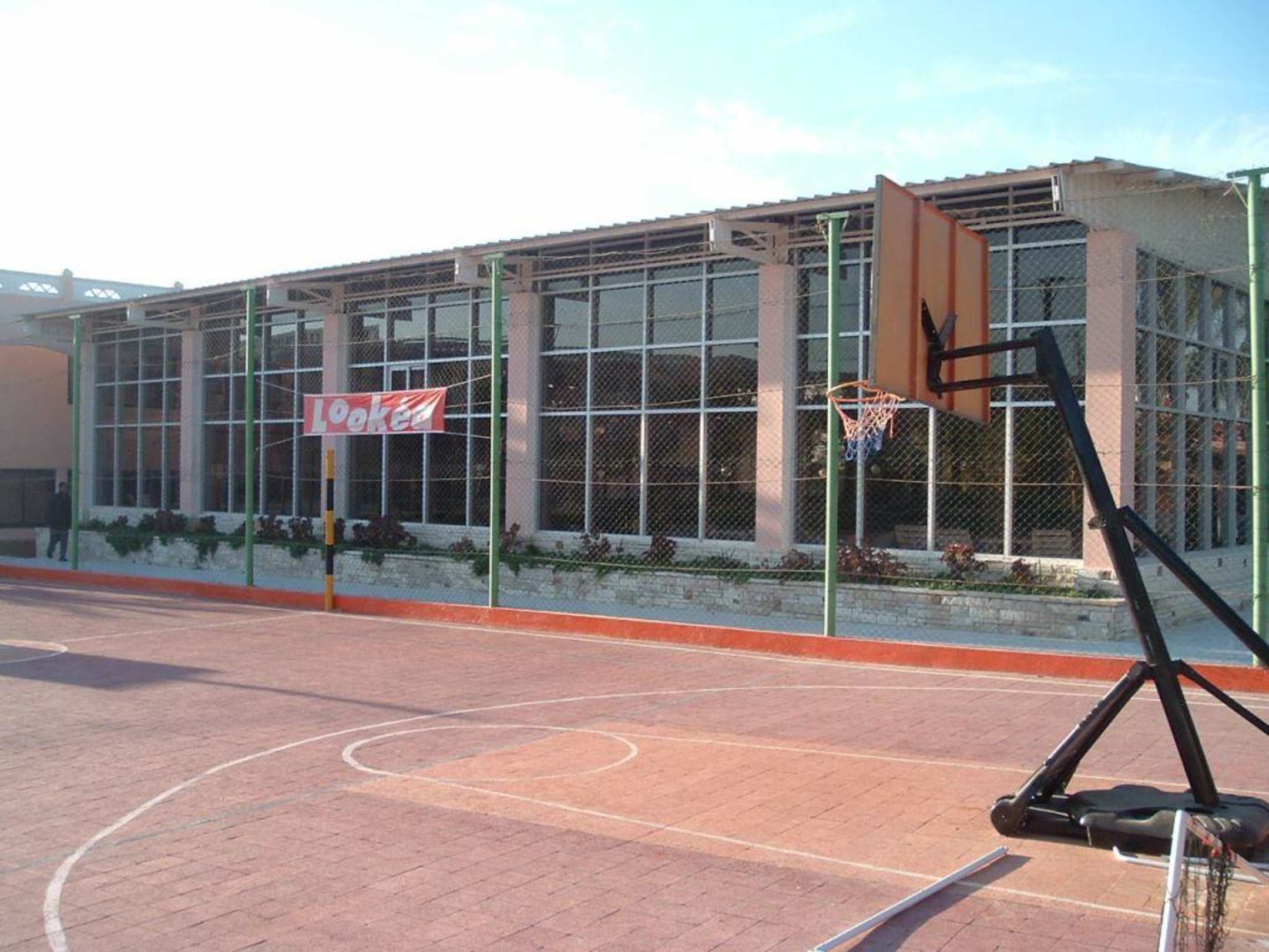 Blick aufs Hallenbad, im Vordergrund der Basketballplatz