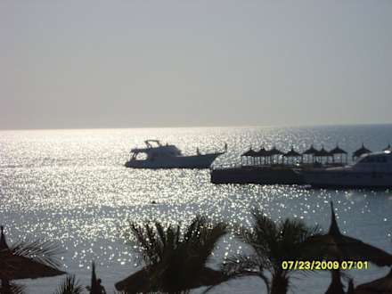 Bei aufgehender Sonne werden die Gäste zu den Schnorchelausflügen abgeholt, einlaufende Schiffe am Steg zwischen Beach Albatros & Palace