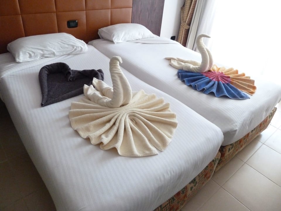 Handtuchfiguren auf dem Bett