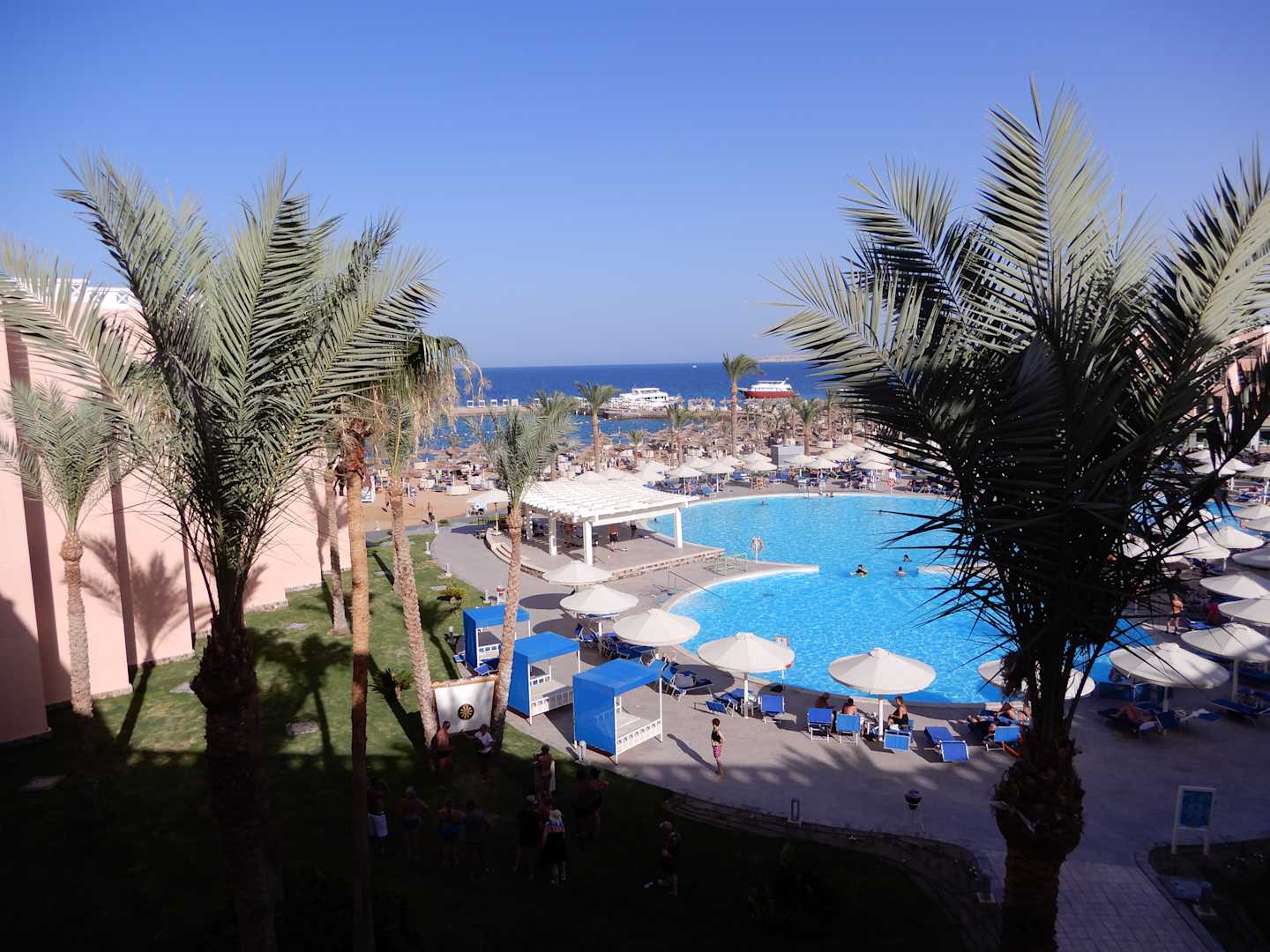 Ausblick von unserem Balkon auf den Pool, weiter hinten das Meer