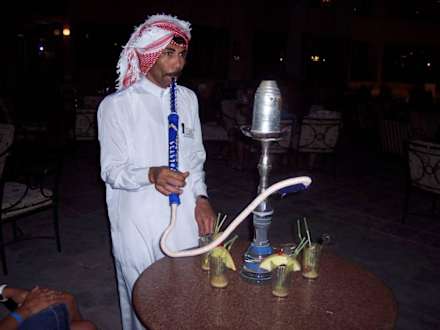 Wasserpfeife rauchenWasserpfeife rauchen war oft angesagt und bei dem Herrn auf dem Bild konnte man diese auch bestellen.