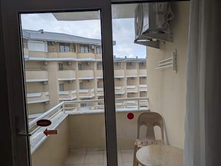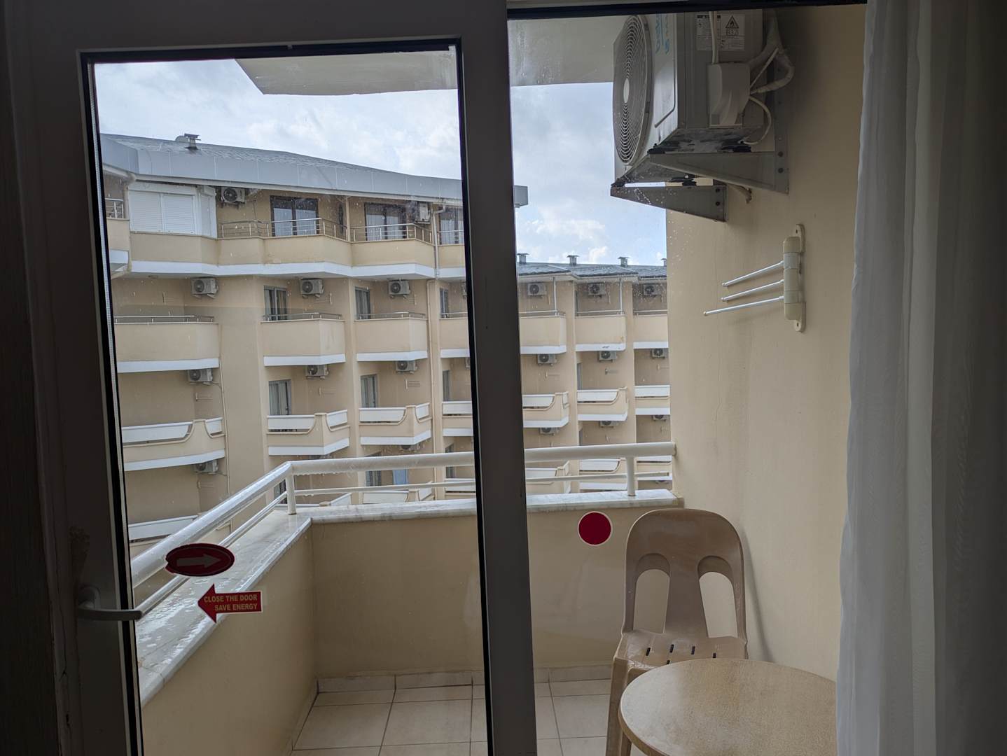 Aussicht durch die Balkontür im ersten Zimmer, obwohl wir Meerblick gebucht hatten.
