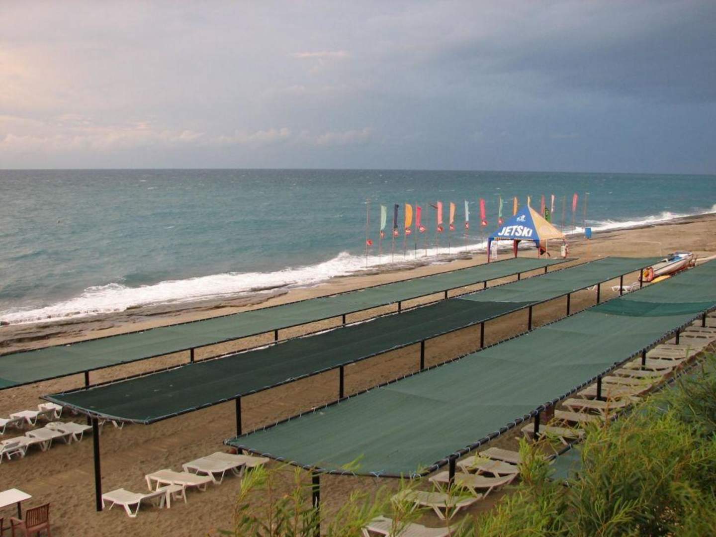 Der Strand des Doganay Beach Clus. Reichlich Liegen und Sonnenschutz aber - wie links am Strand zu sehen - fast nur Felsgestein. Sauglatt - nicht zum Begehen oder Baden geeignet!
