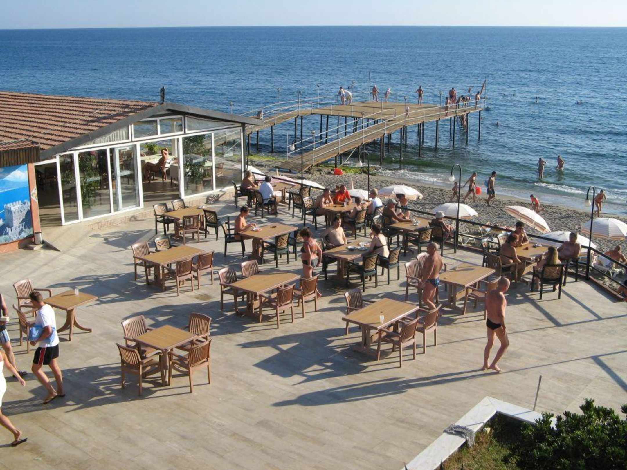 Beachbar mit Terrasse und im Hintergund der Steg