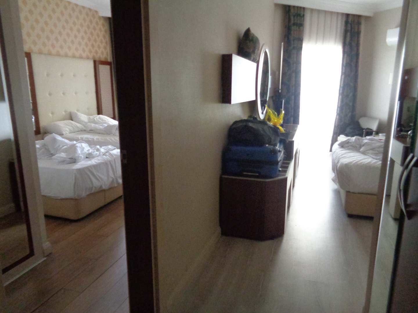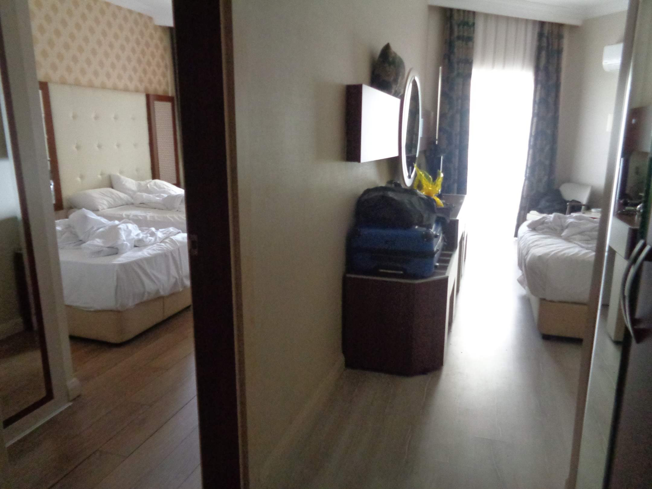 Zimmerlinks ein Zimmer mit 3 Schlafplätzen und Bad und Balkon und rechts ein Zimmer mit 2 (+1) Schlafplätzen und Bad und Balkon.
