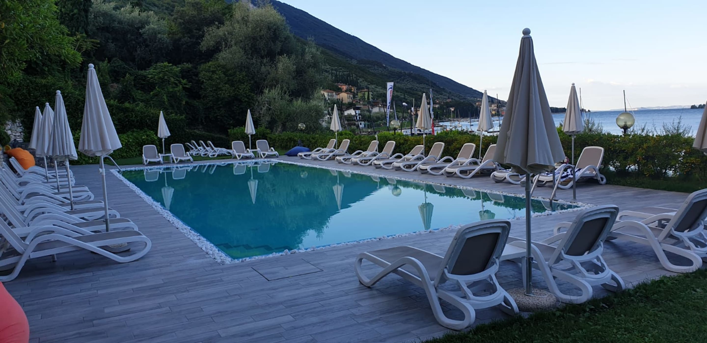 Der schöne und neuangelegte Pool mit Blick auf den See.