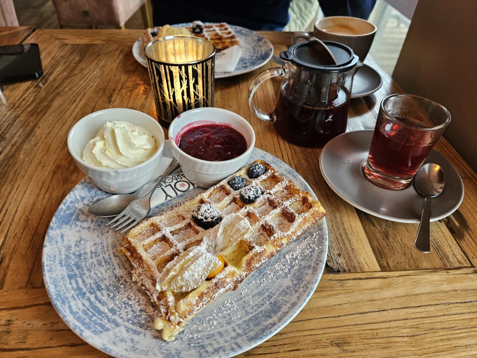 Waffeln mit Sahne und warmen Früchten
