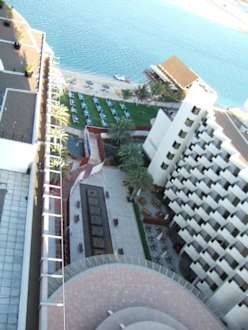 Man sieht den Innenhof, und einen kleinen Teil der Poollandschaft. Leider begannen hier am Ende unseres Urlaubs auch Bauarbeiten, man sieht bereits den Bauzaun.