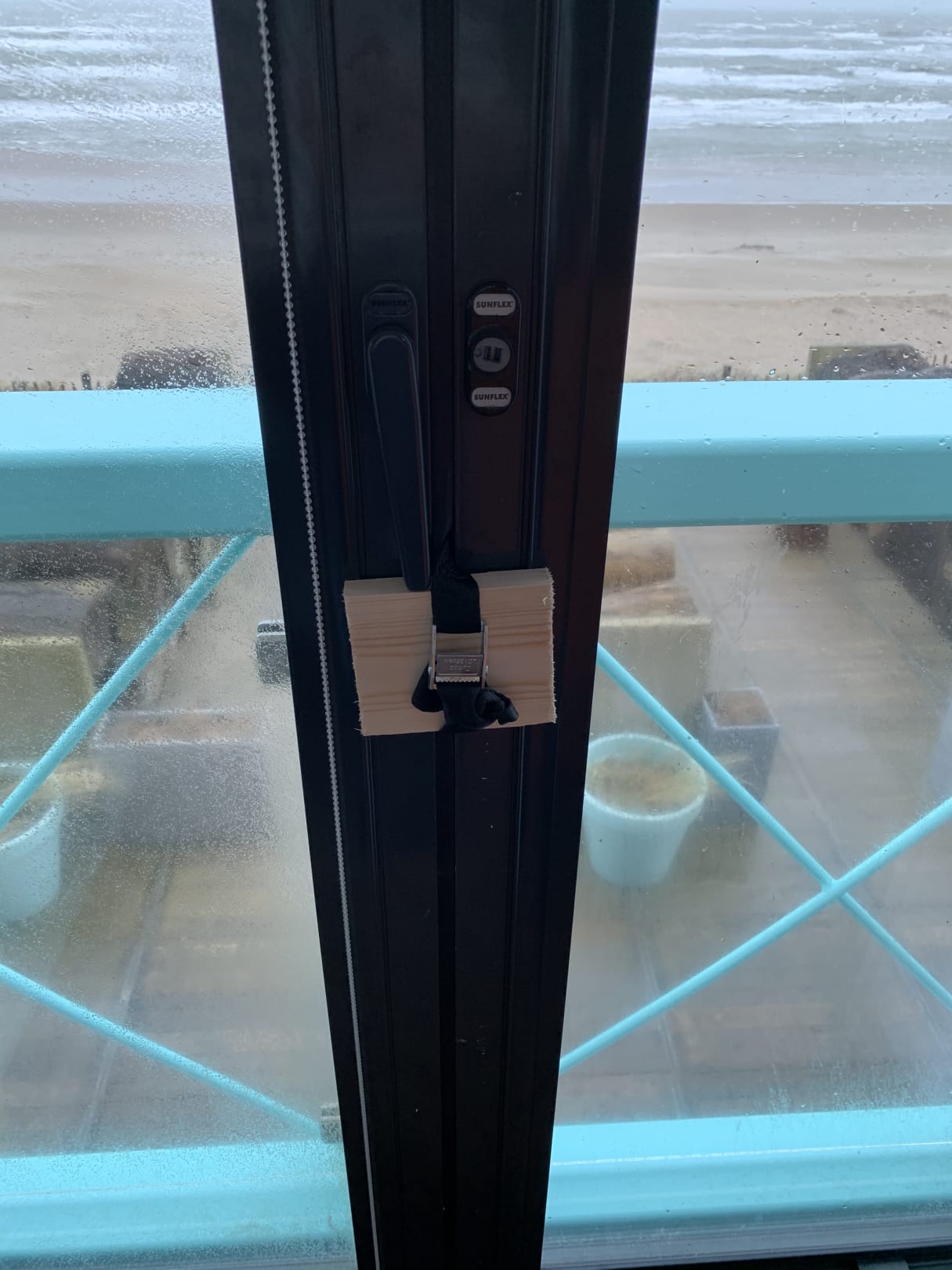 Fenster gingen nicht zu öffnen , da diese mit Spanngurte und Holz verzurrt waren