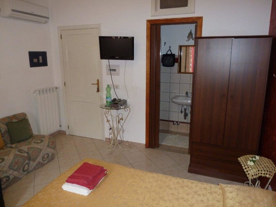 Einfaches Doppelzimmer. Gefliest. Kleiner Flachbild-TV ohne deutsche Programme hängt neben der Eingangstür. Kleiner Kleiderschrank. Einfache Sitzmöbel. Kleiner Glastisch. Blick ins kleine Bad. Gute Klimaanlage.