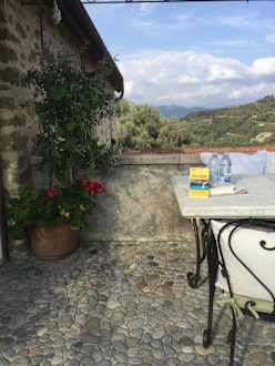 Frühstücksterrasse und Blick nach hinten in die Berge