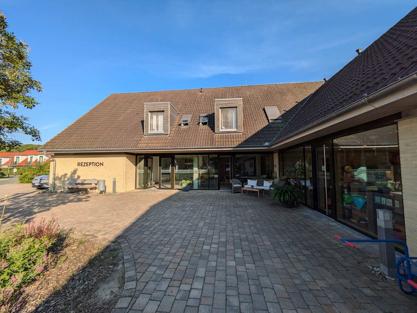 Rezeption mit Dorfladen im Zentrum des Resorts