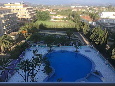 Blick aus dem 5. Stock auf den Pool und Minigolf