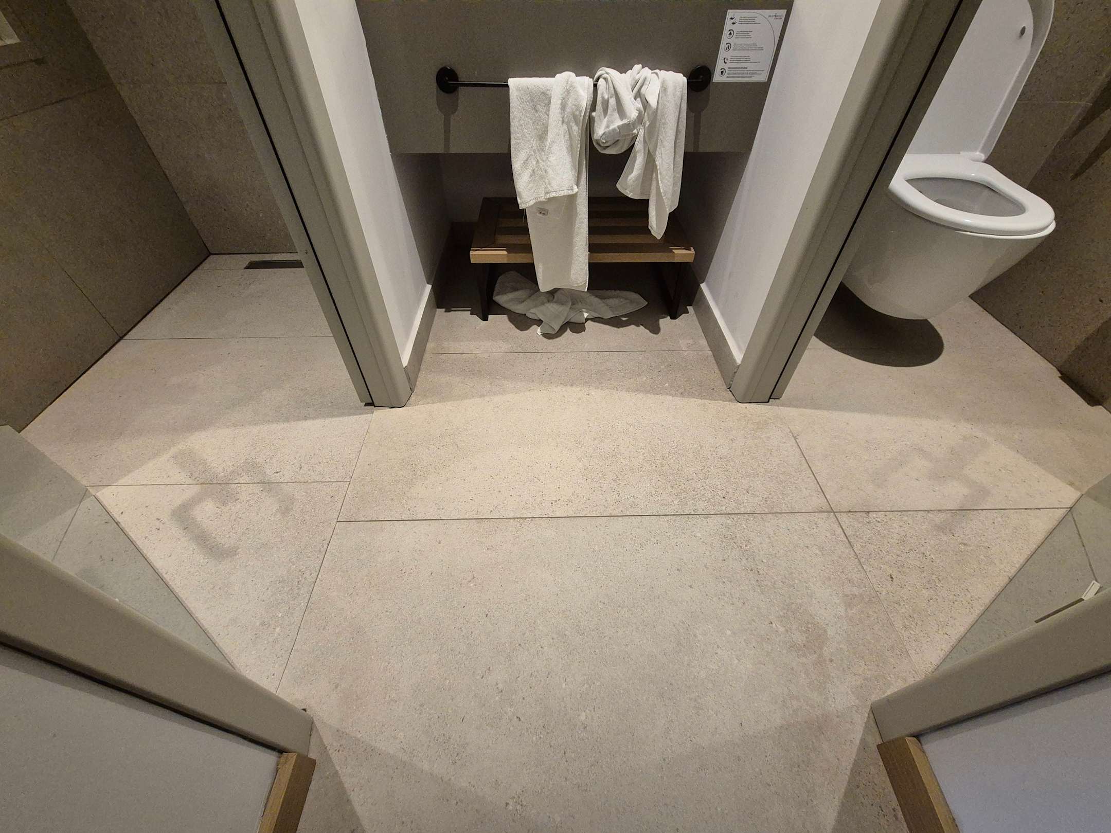 Zimmeroffenes Bad im Zimmer, links große Dusche mit Regendusche, rechts WC, in der Mitte offen ein Waschbecken.
