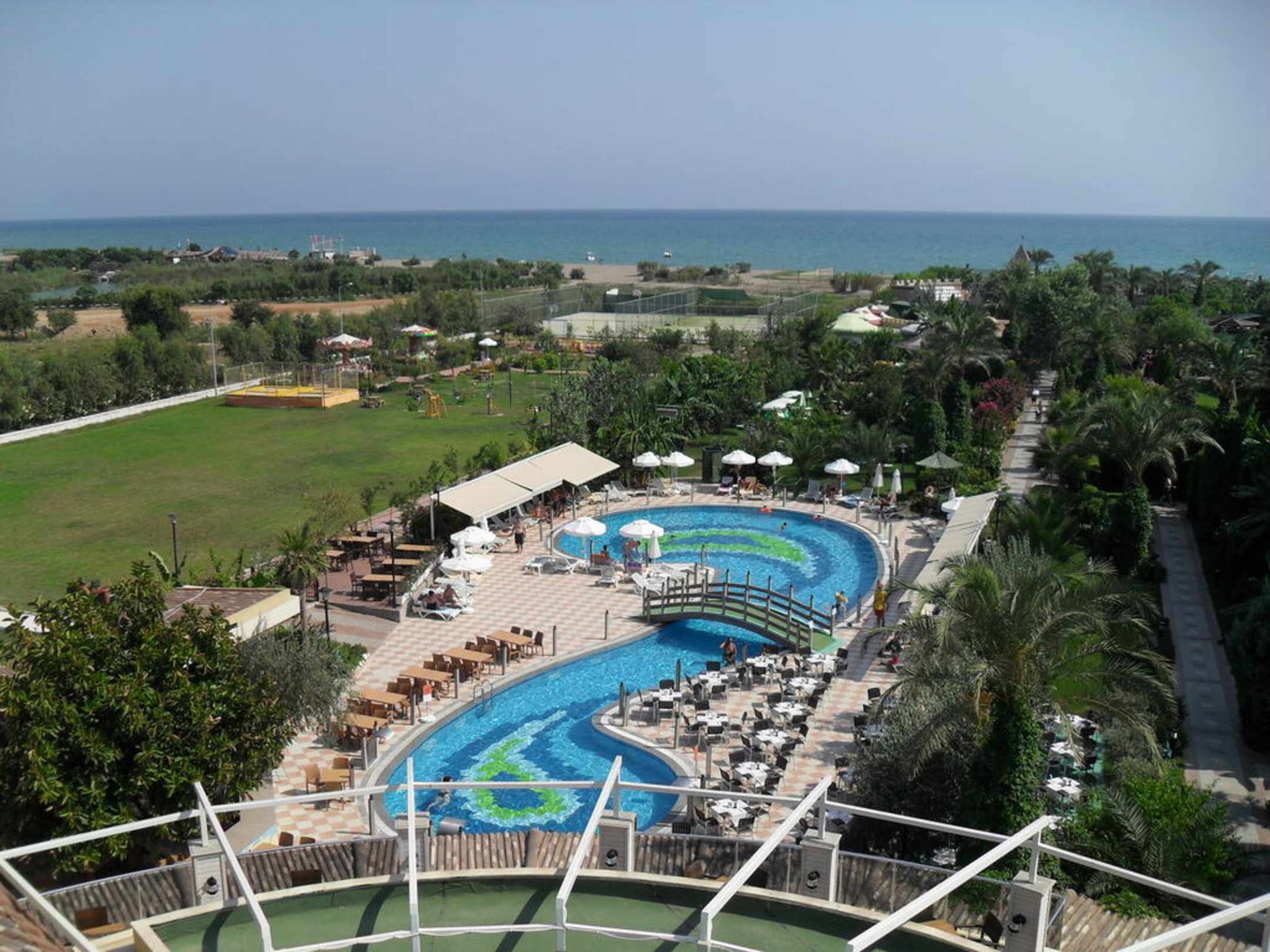 Blick von unserem Balkon...man erkennt deutlich die Anlage mit dem Pool im Vordergrund und das Meer am oberen Bildrand.