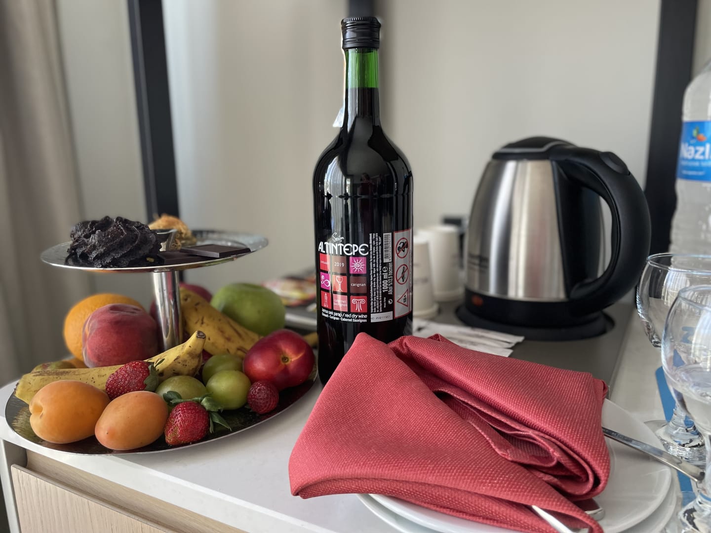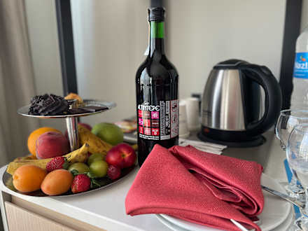 Zur Begrüßung Flasche Wein und Obst auf dem Zimmer