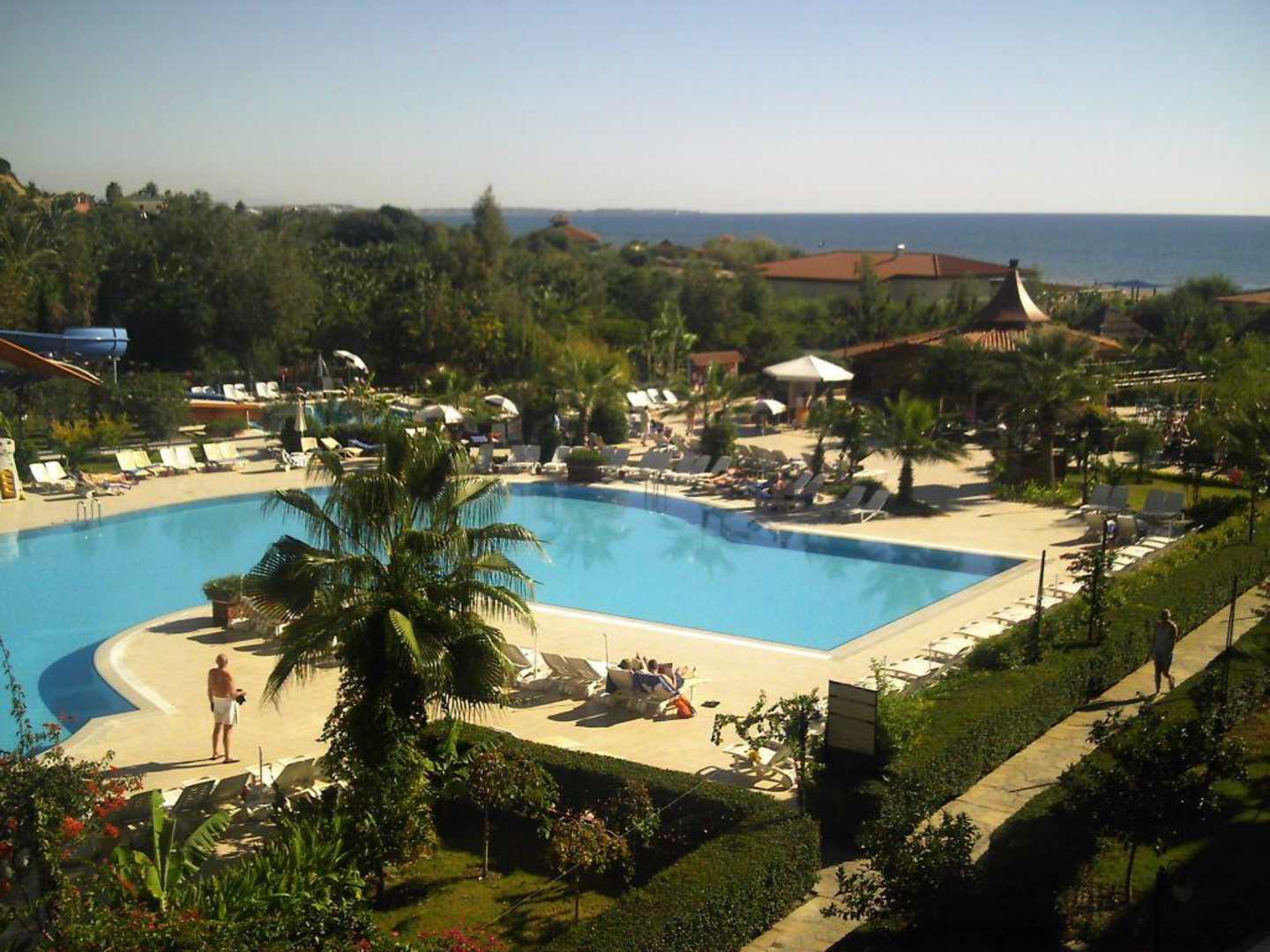 So wird man gerne wach!Der Pool fotografiert vom Zimmer aus mit Blick auf die traumhafte Gartenanlage und das Meer!