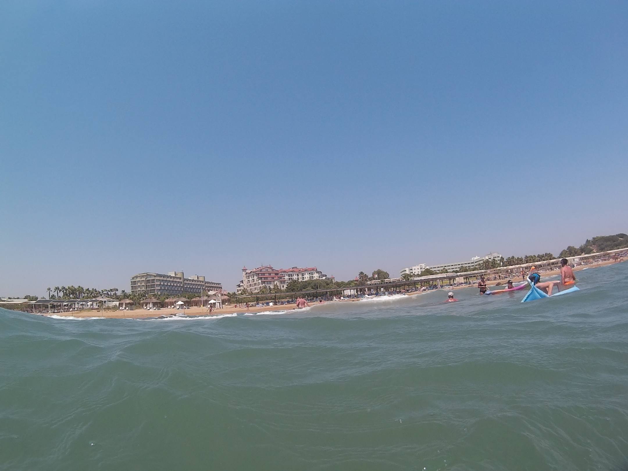 Vom Meer aus zum Hotel/ Strand. In der Mitte ist das Bella Resort.