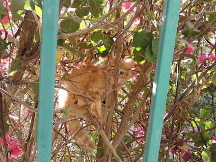 Kätzchen in Buogainvillea am Balkon