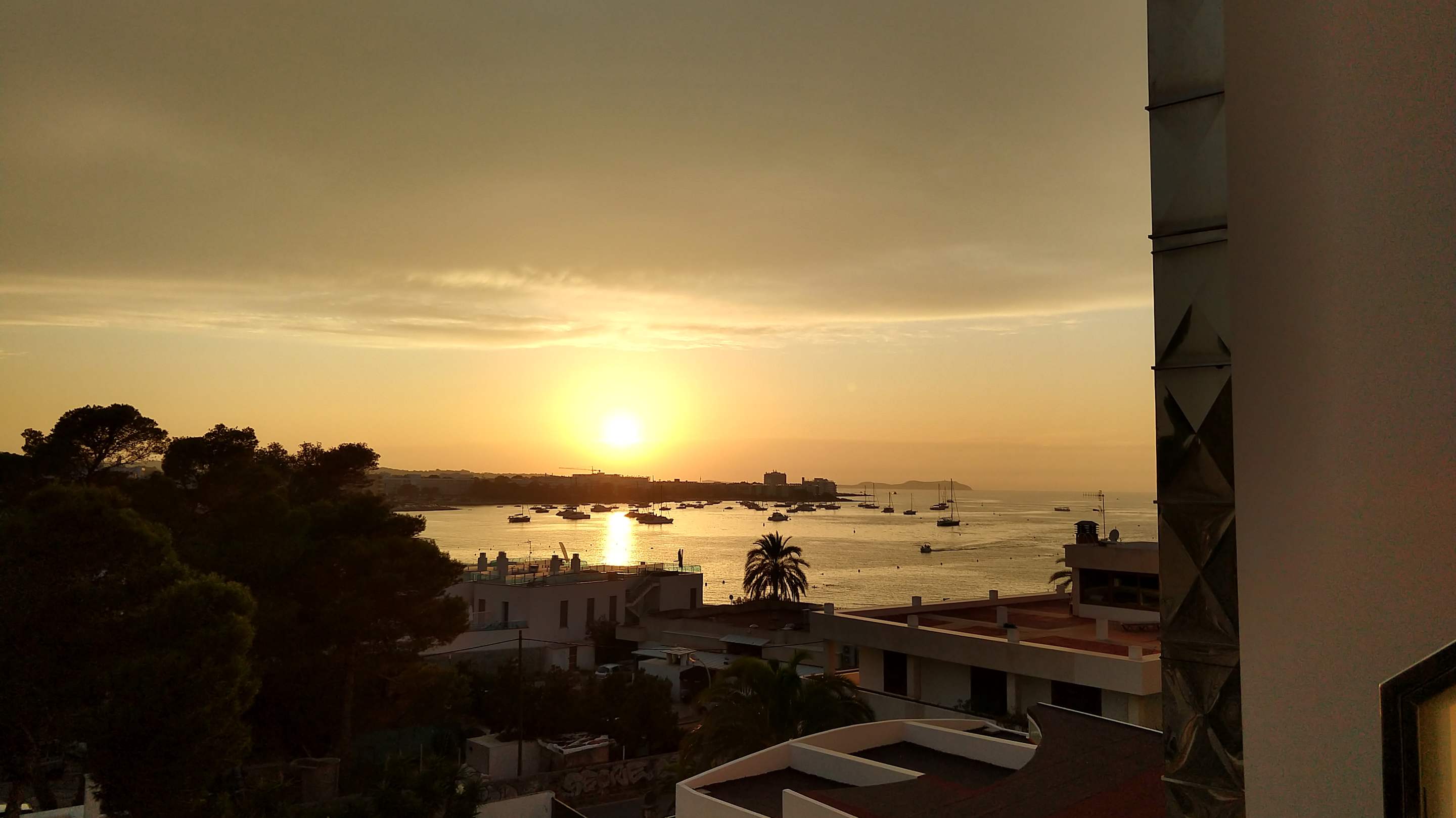 Sonnenuntergang über der Bucht von San Antonio, Blick vom Zimmer mit seitlichem Meerblick