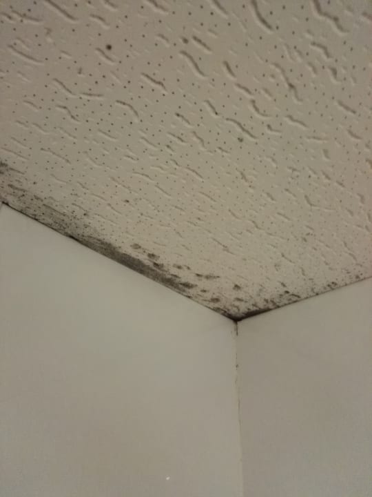 Über der Dusche kann man deutliche Schimmelflecken erkennen, die durch das Duschen hervorgerufen werden. Ausser einer Tür gibt es kein Möglichkeit, nach dem Fuschen die warme Luft abziehen zu lassen.