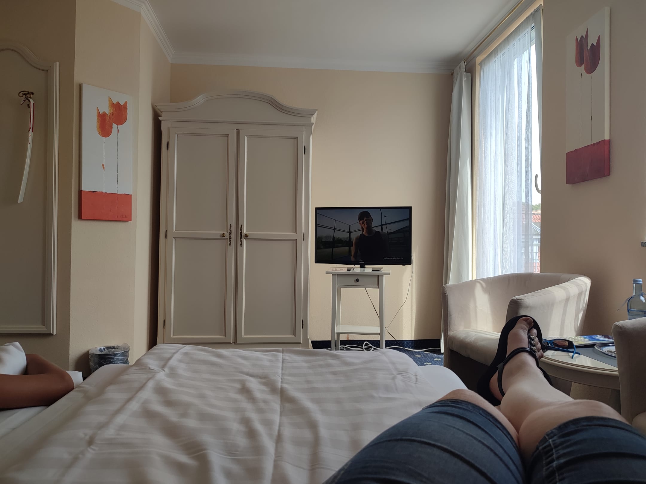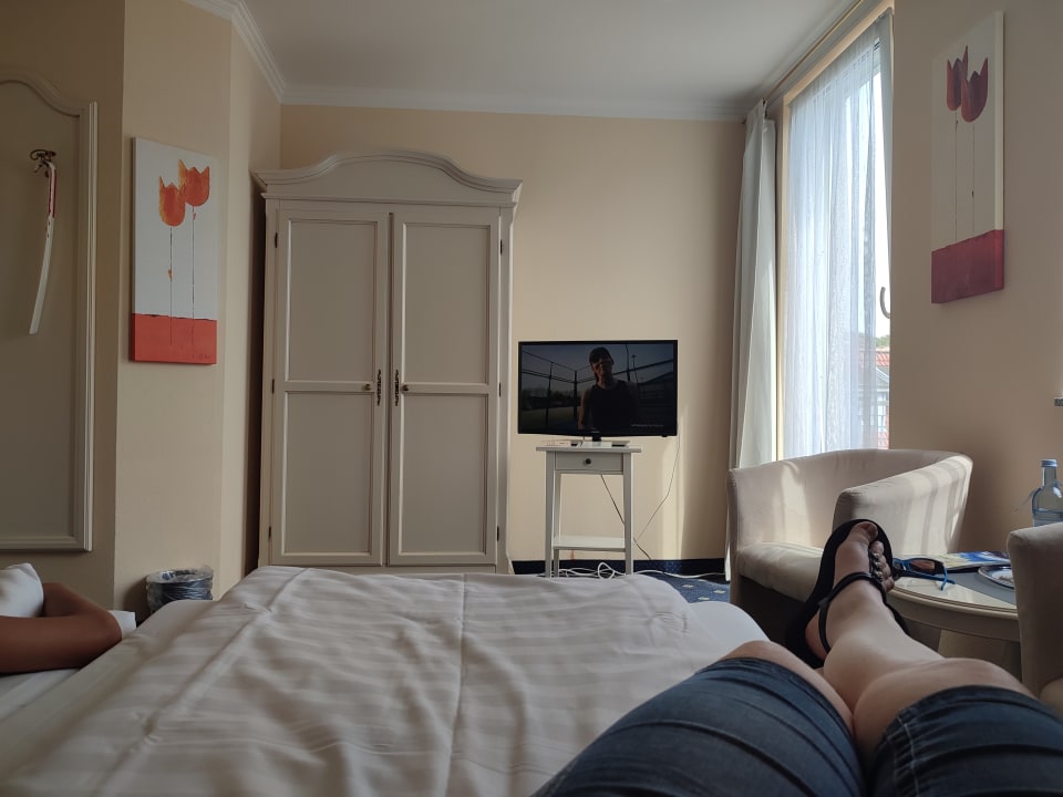 Mini TV, Kabelsalat und braunen Dreckfleck an der Wand! Gab auch keine Steckdose am Bett...