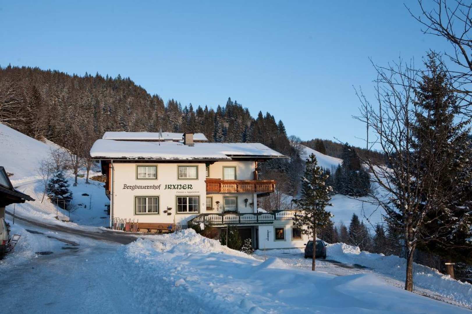 BergbauernhofVorderansicht des Hofes mit den Fremdenzimmern. Links unten sieht man die Zufahrt zu den überdachten Garagen, was gesonders im Winter angenehm ist. Man sieht das Heck des ersten Autos. Die Garagen sind auch in der Hauptsaison ausreichend