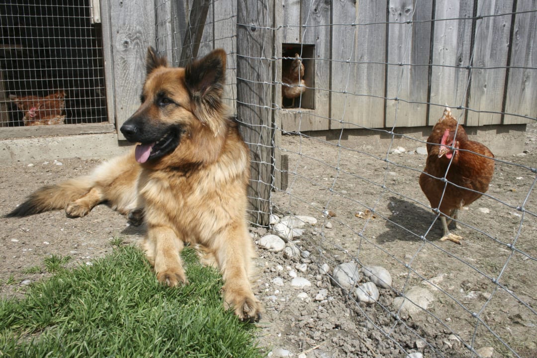 Hofhund Lina passt auf die Hühner auf