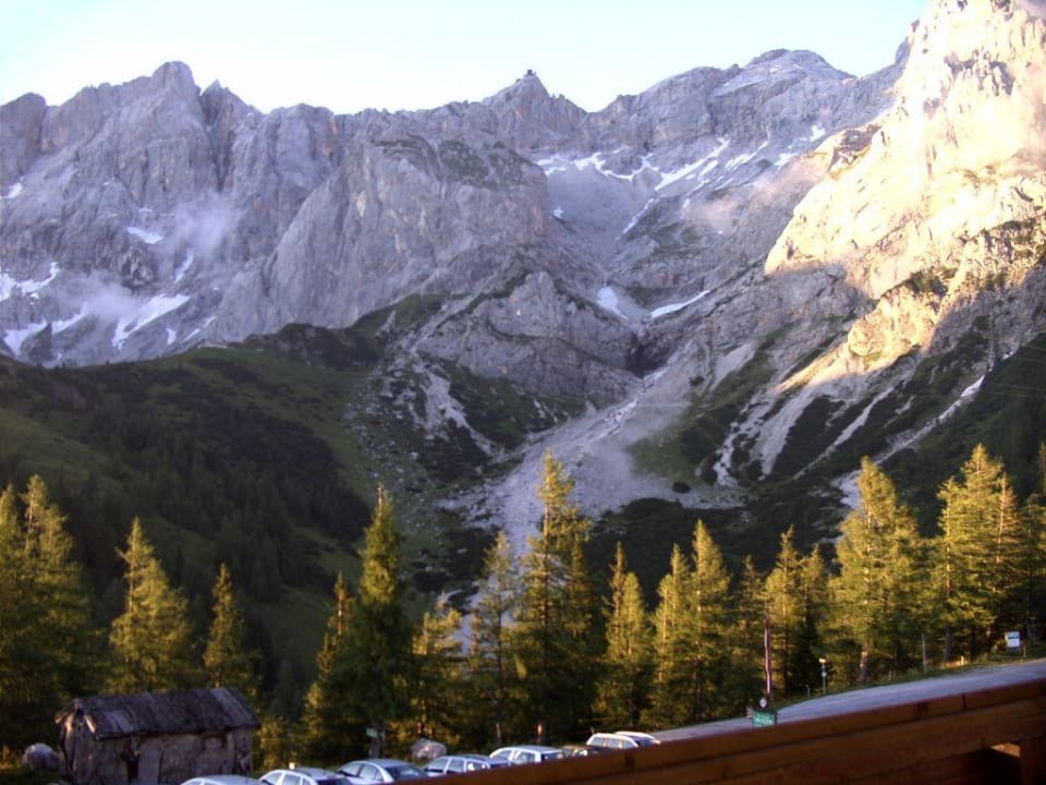 Blick vom Balkon des Berghotels zum Dachsteinsüdwand mit Hütte