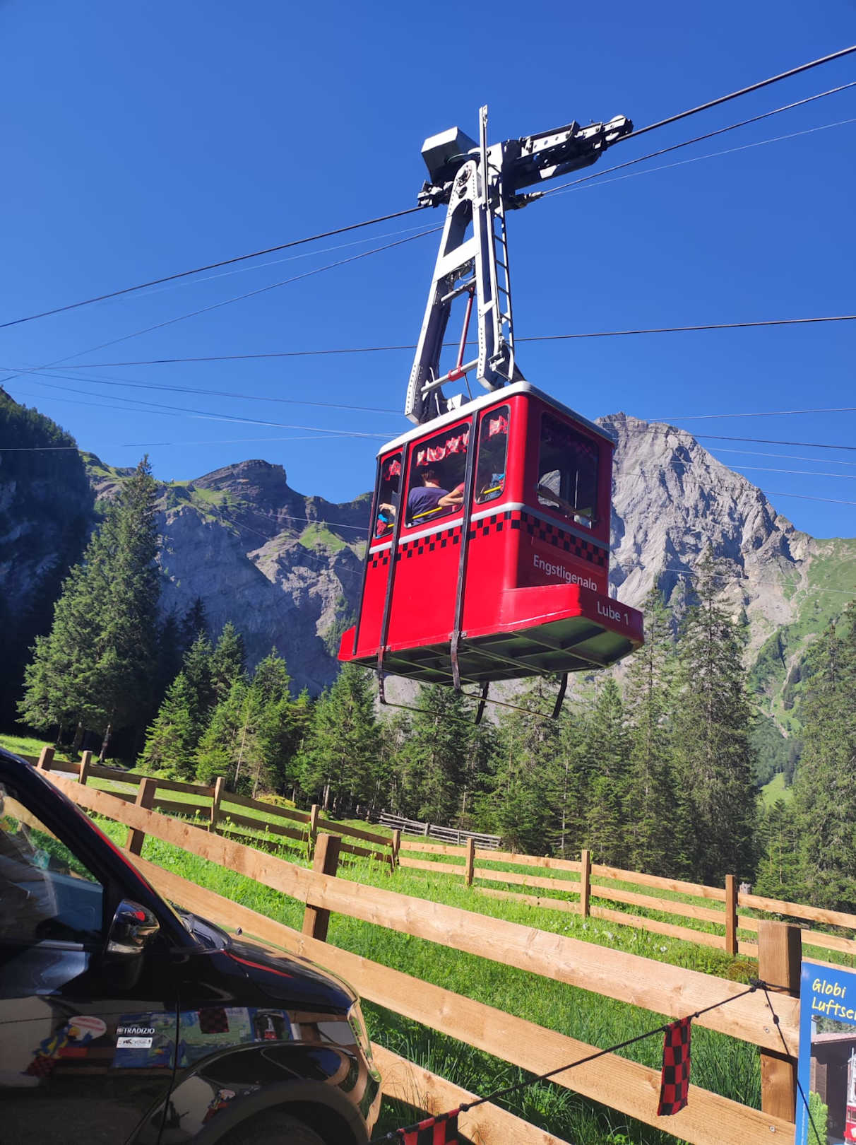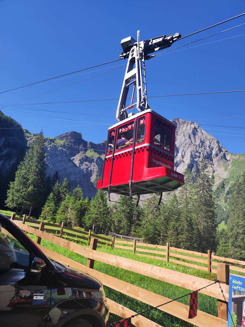 hier ist der Kinderfreund Globi "zu Hause" - ist man im Hotel eingecheckt, darf man diese Globi-Bahn (und die normale größere Kabine, die parallel fährt) kostenlos nutzen, so oft man will