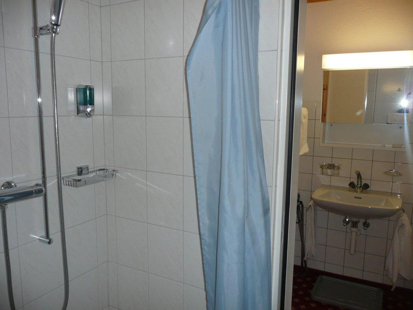 Das BadIm Badezimmer selbst befanden sich die Dusche und die Toilette. Das Waschbecken befand sich sepberat im Eingangsbereich des Schlafzimmers.