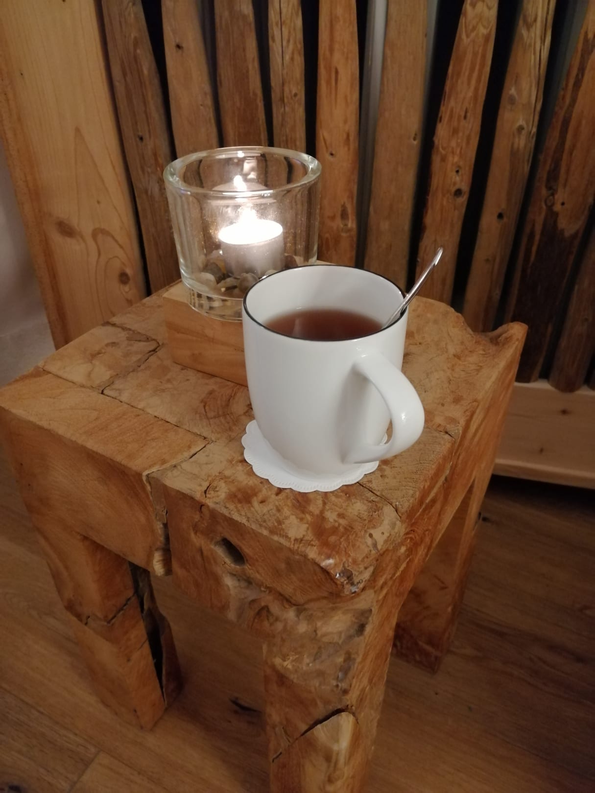 Ein kleiner Beitisch mit einem kleinen Kerzchen im Zimmer..... Für lauschige Abende.