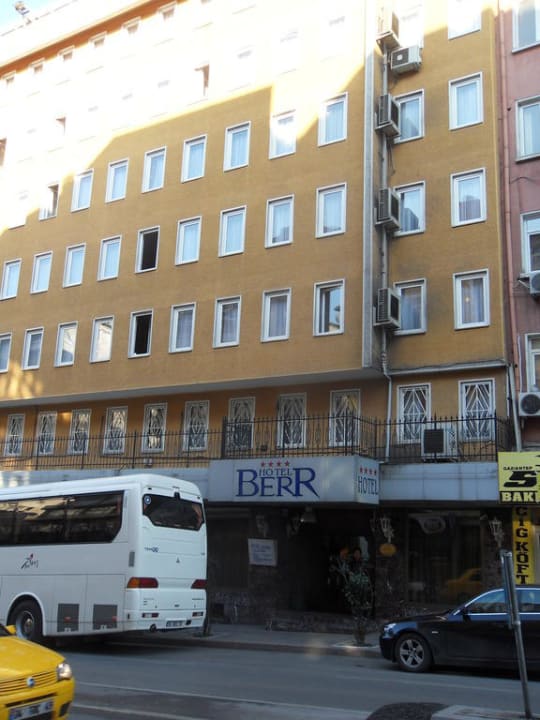 Außenansicht des HotelsDer Busparkplatz vor dem Hotel wird von den Hotel-Mitarbeitern mit mobilen Parkverbotsschildern freigehalten.