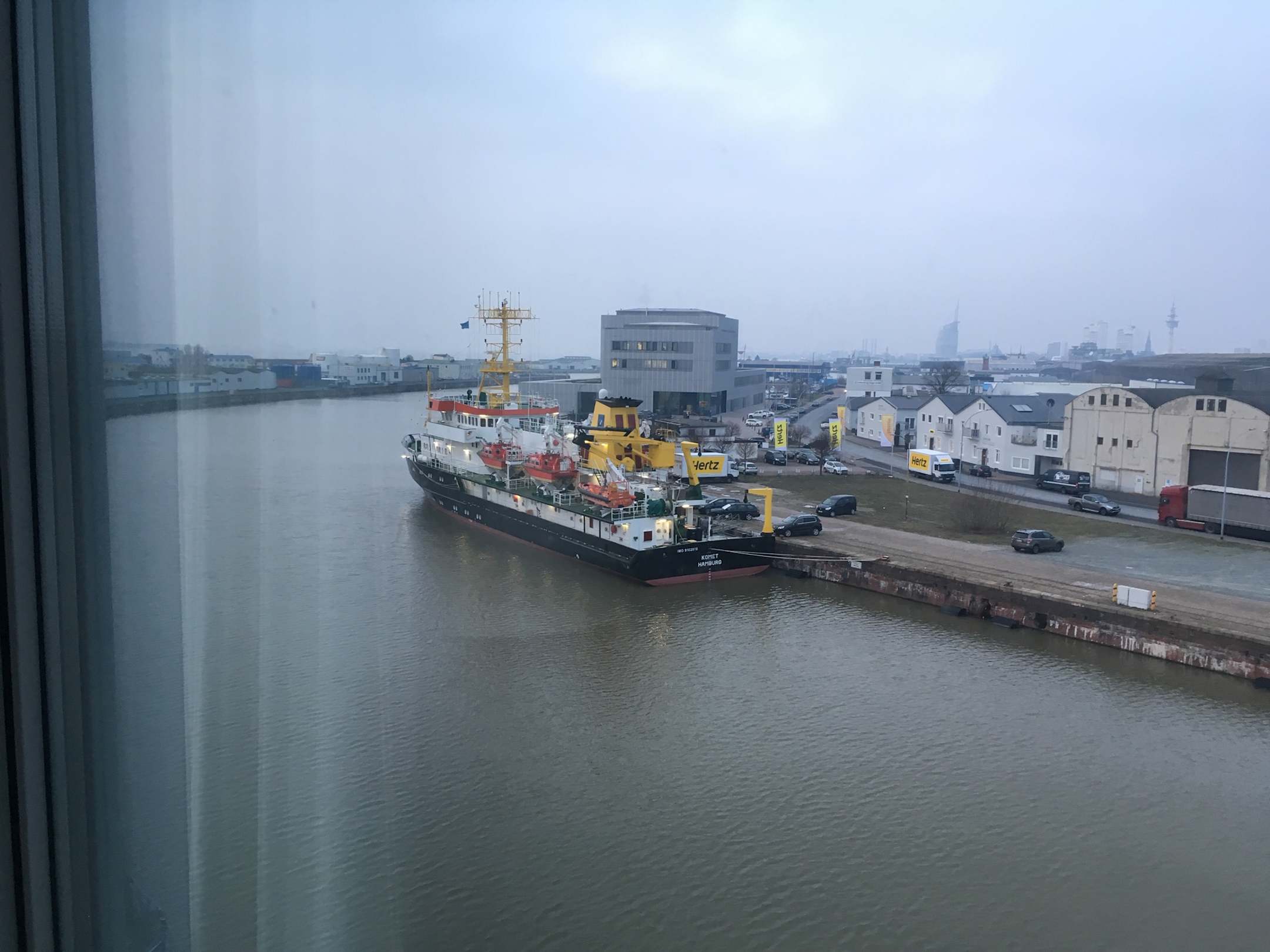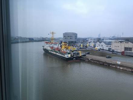 Blick auf einen Teil vom Hafen, vom Zimmer aus ein Schiff entdeckt bei Tag.