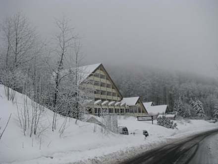 Hotel im Winter-Nebel