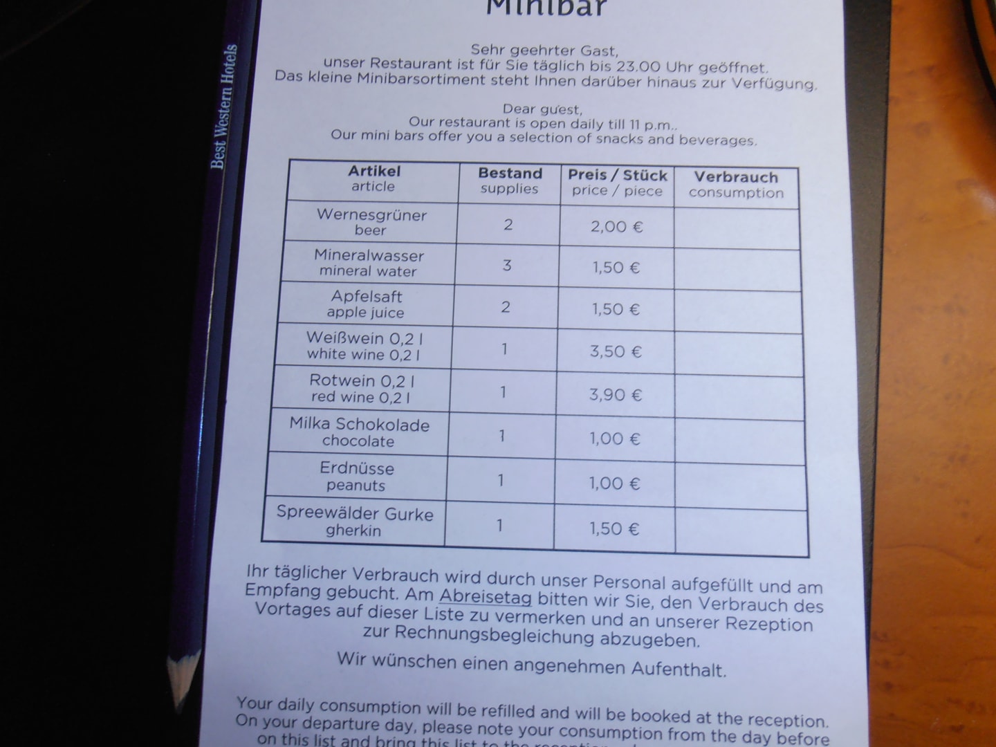 Getränkepreise der Minibar