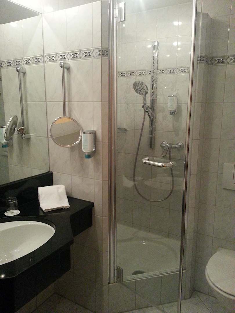 Bad mit Waschtisch und Duschkabine