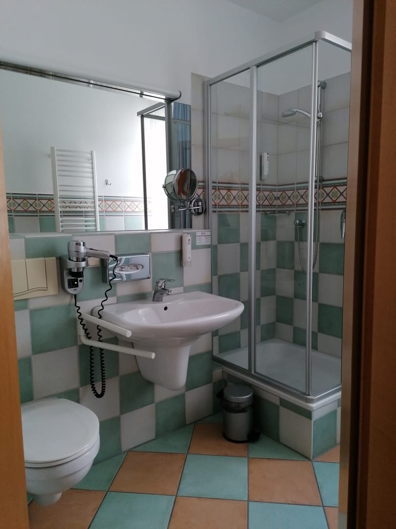 Das Bad des Einzelzimmers, mit Ablage am Spiegel.