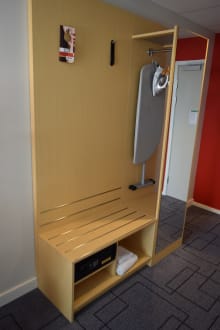 Standard-Doppelzimmer. Leider kein Schrank. Nur eine Mini-Garderobe. Dafür aber Bügelbrett und Bügeleisen, Kofferablage und kostenfrei nutzbarer Zimmersafe...