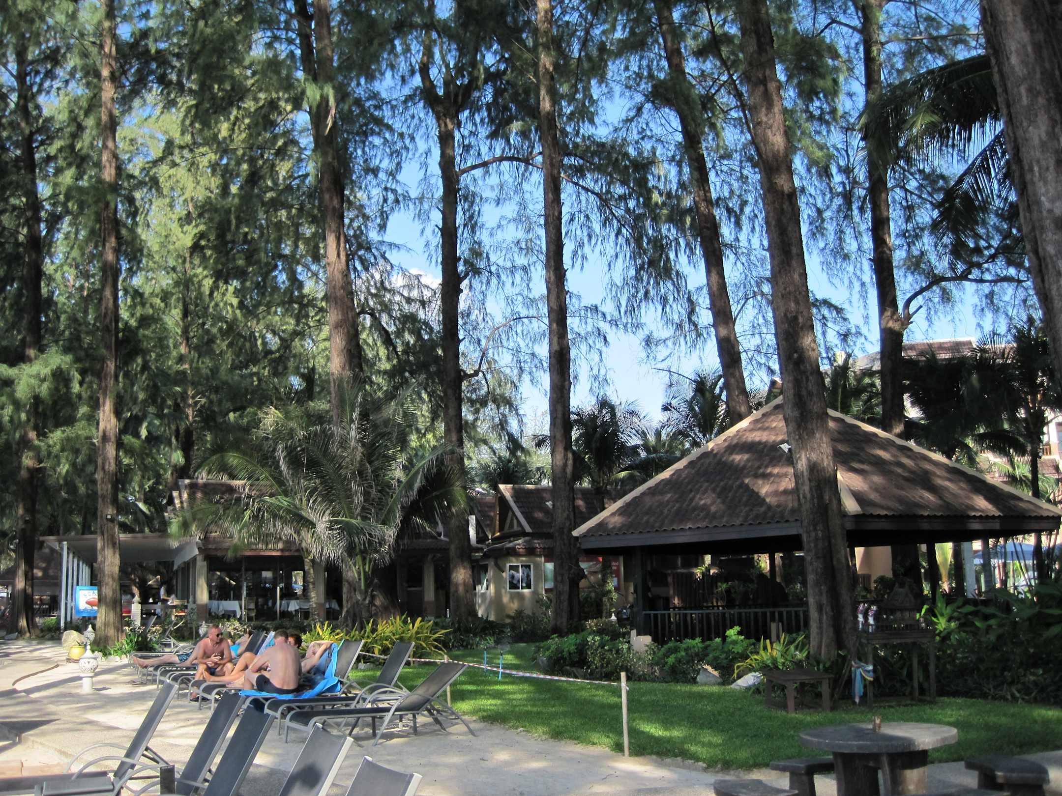 Blick von den Liegen am Strand Richtung Pool