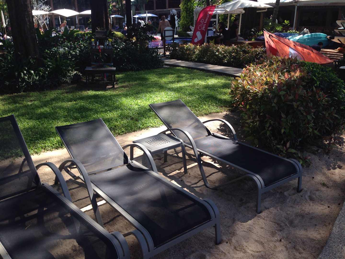Sonnenliegen zwischen Pool und Strand