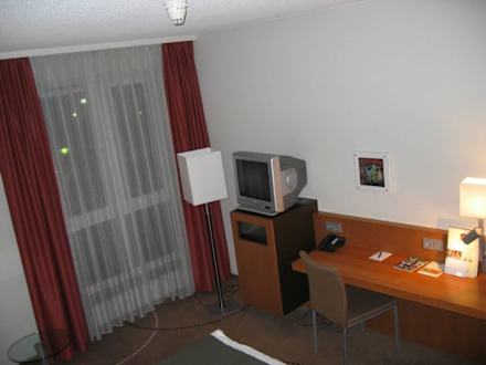 Blick auf Fernseher und Schreitisch. Fenster zum Öffnen