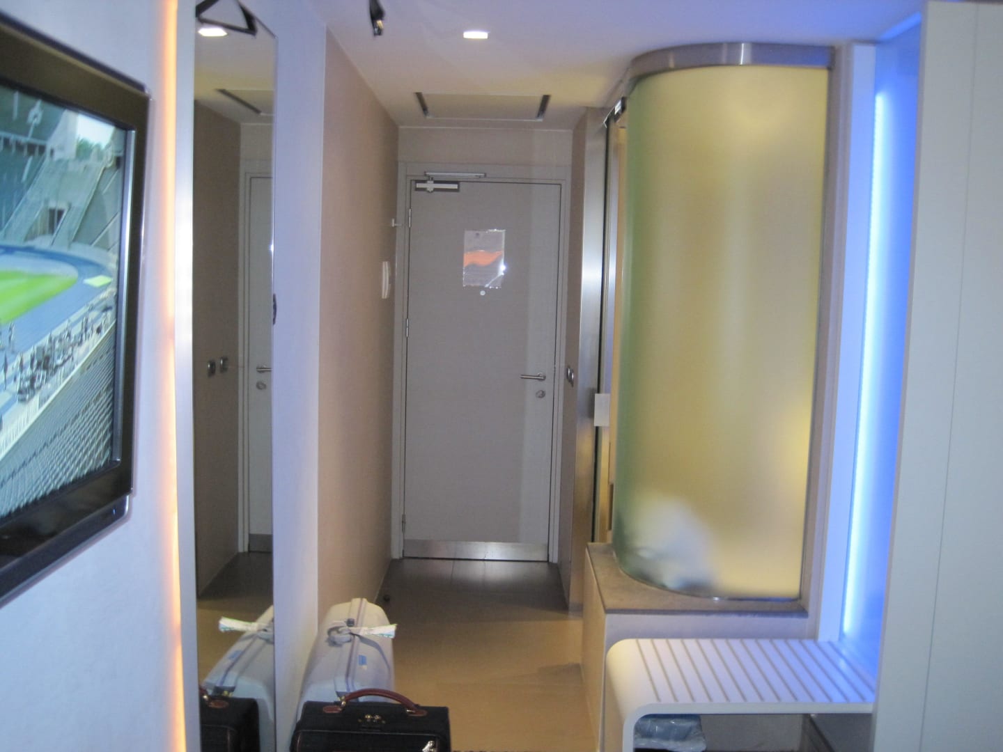 Rechts die Wand zum Bad ist aus Milchglas. Wenn in der Nacht jemand ins Bad geht wird es dadurch im Zimmer taghell.