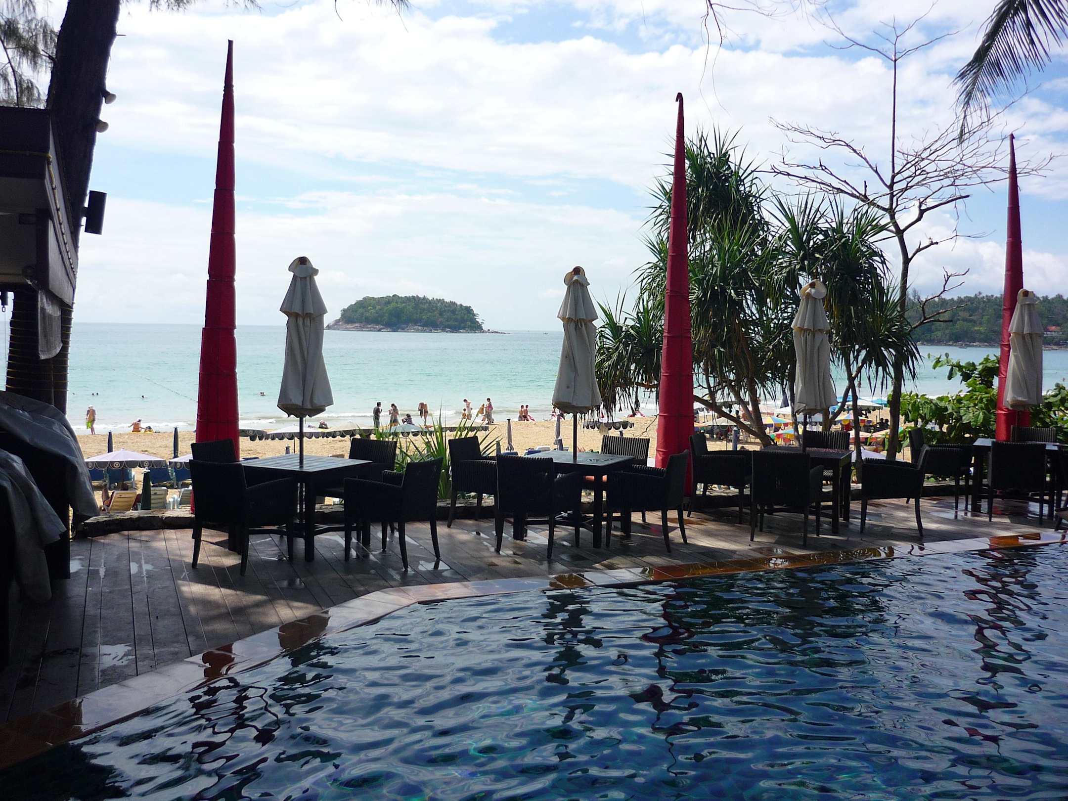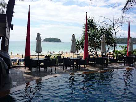 Ausblick auf Pool und direkt dahinter Strand