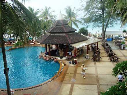 Ausblick vom Zimmer auf Pool und Strand