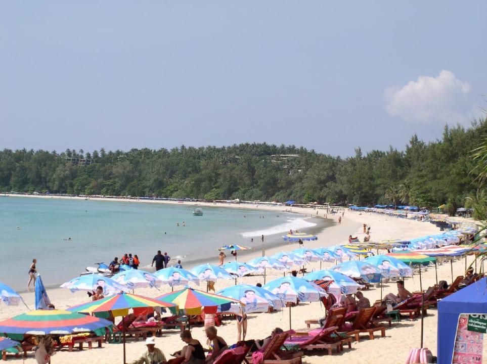 Blick vom Rand der Hotelanlage über den Strand Kata Beach. Die Liegen am Strand gehören nicht zum Hotel und sind gebührenpflichtig. Feiner Sandstrand.