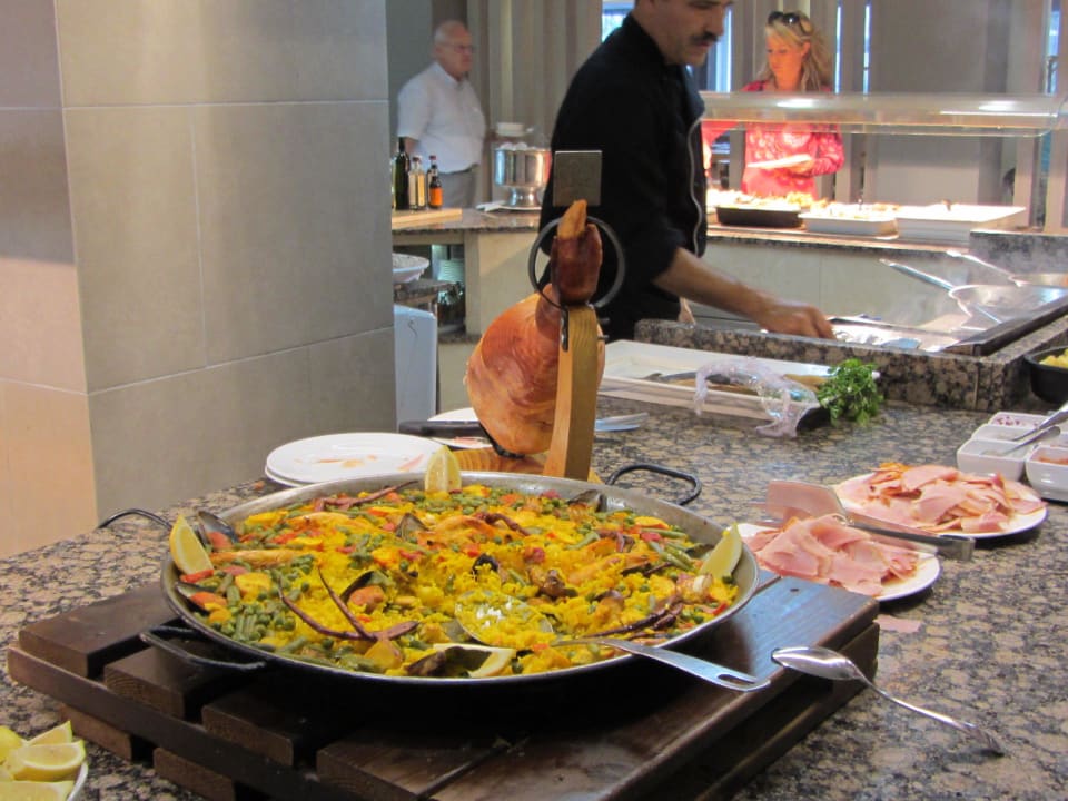 Paella und Schinken am Speisenbuffet