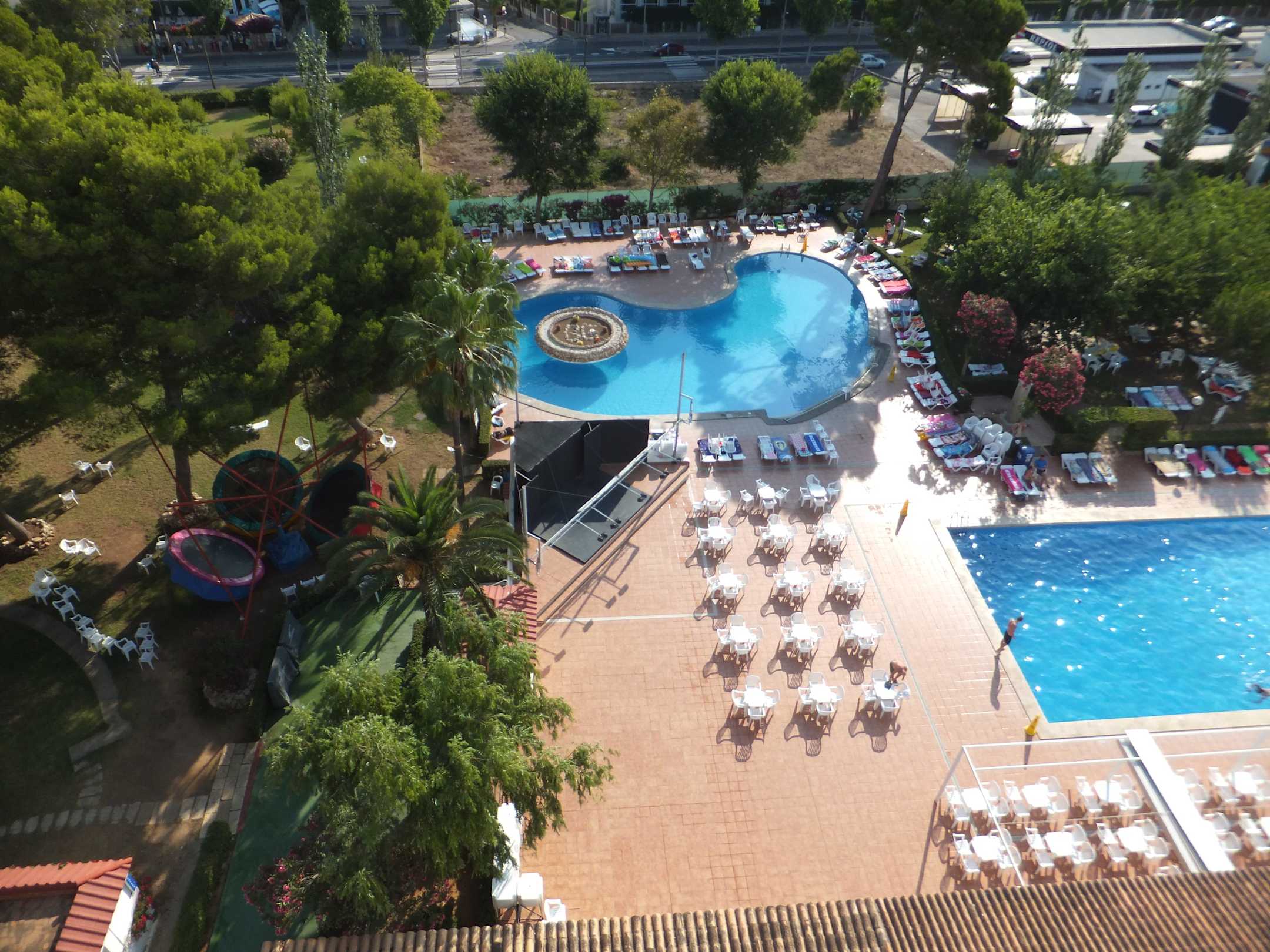 Von Balkon auf Pool und Liegbereich